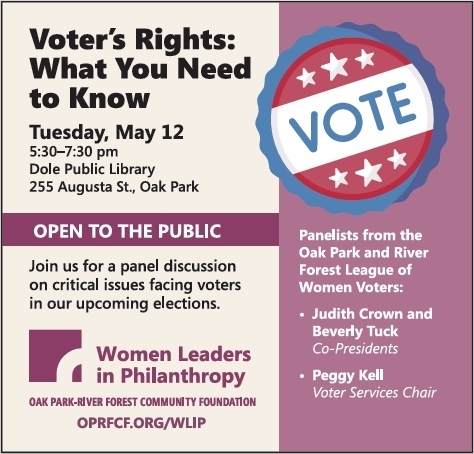 The event will feature speakers from the League of Women Voters Oak Park-River Forest, including co- presidents Judith Crown and Beverly Tuck and voter services chair Peggy Kell.