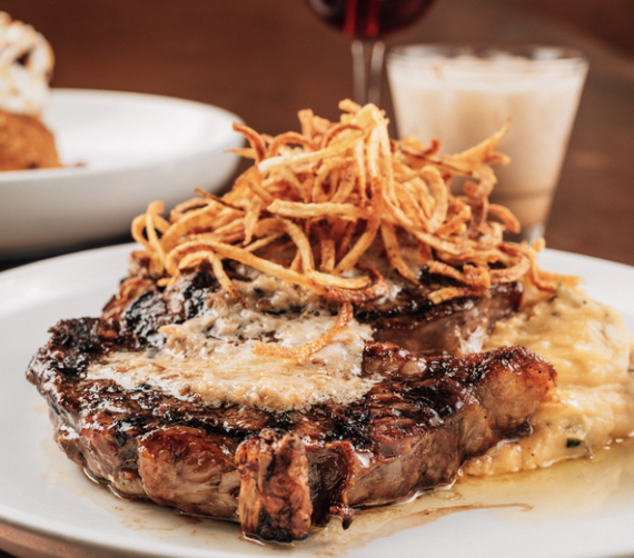 Rib Eye – 14 oz Rib Eye steak, smoked garlic butter, charred brussels sprouts with bacon jam, chipotle-cheddar mashed potatoes, crispy potato haystack – $38.95