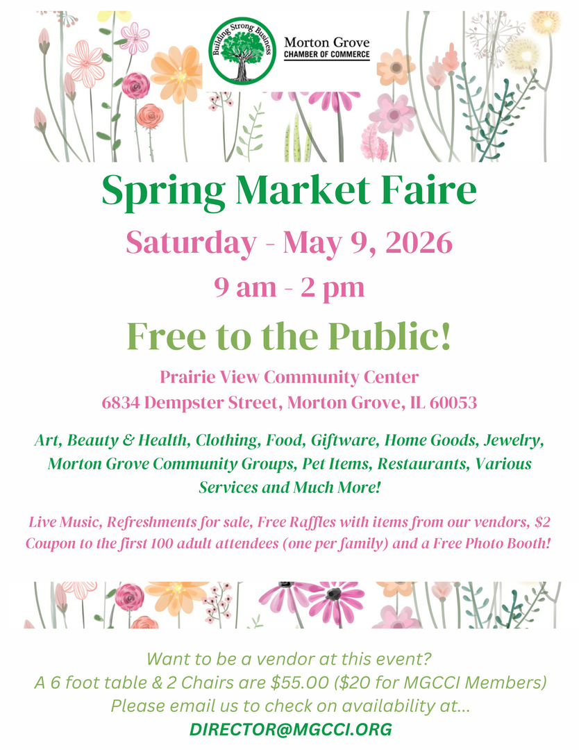 The Morton Grove Chamber of Commerce presents the SPRING MARKET FAIRE on Saturday, May 9, 2026 at Prairie View Center (6834 Dempster Street, Morton Grove, IL 60053) from 9 am to 2 pm in the Main Floor Gym. This FREE TO THE PUBLIC event will feature over 70 tables of vendors with goods and services for the community.