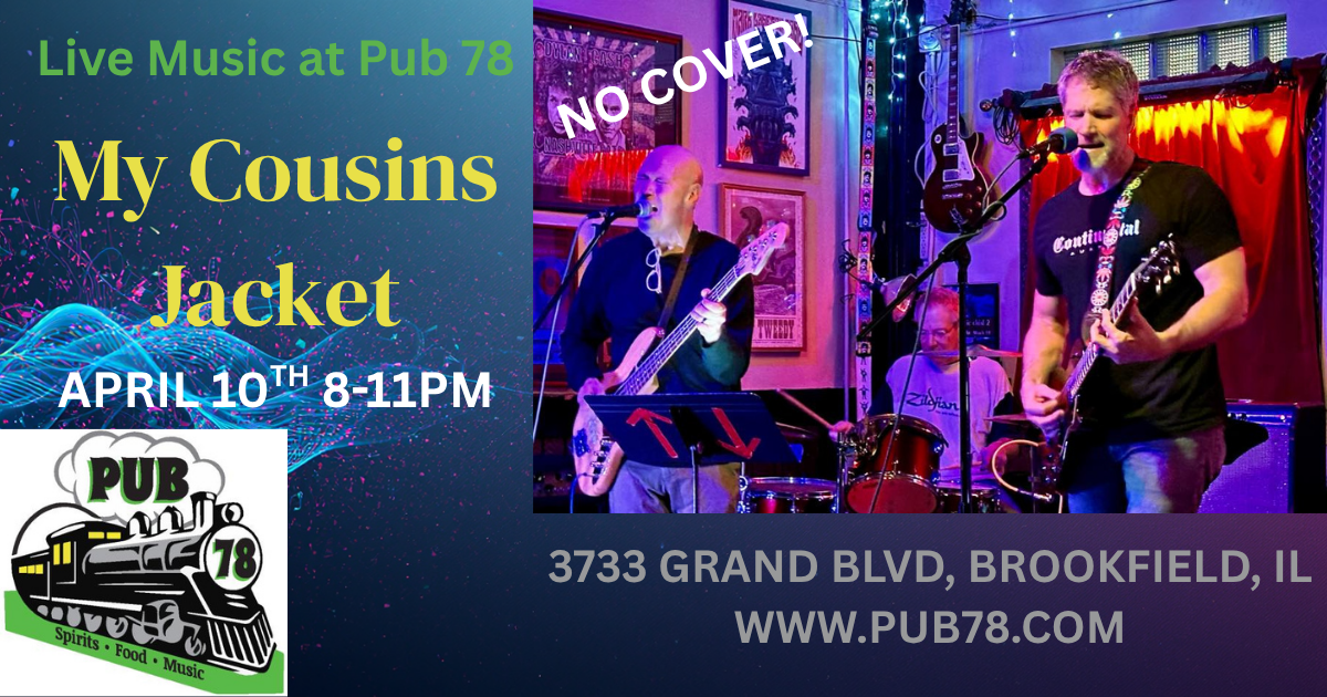 HomeEventsMy Cousins Jacket - Live Music My Cousins Jacket - Live Music Friday, April 10, 2026 8:00 PM - 11:00 PM 8:00 PM - 11:00 PM See all dates and Times Pub 78 Parking Deals Get a Ride LYFT UBER Add to Calendar 04/10/2026 08:00 PM 04/10/2026 11:00 PM America/Atikokan My Cousins Jacket - Live Music My Cousins Jacket returns to Pub78! A great set list of your rock favorites! No Cover ever!Event LinksWebsite: https://go.evvnt.com/3549188-0 Details & Tickets: https://www.upcomingevents.com/chicago/events/pub-78/my-cousins-jacket-live-music-626367?ref=uceaddevent Pub 78, 3733 Grand Boulevard, Brookfield, IL, 60513 Set Reminder Categories Concert, Indoor / Outdoor Event, Live Entertainment, Live Performance, Performing Arts View Event Website » My Cousins Jacket returns to Pub78! A great set list of your rock favorites! No Cover ever!Event LinksWebsite: https://go.evvnt.com/3549188-0