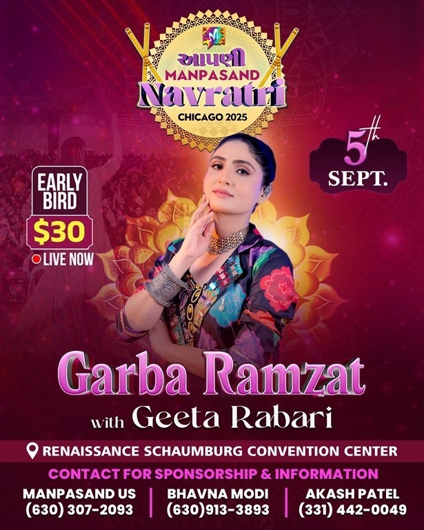 Get ready for an unforgettable night of traditional music, rhythm, and high-energy celebration at Garba Ramzat with Geeta Rabari – part of Manpasand Navratri Chicago 2025. Join us as the beloved voice of Gujarat, Geeta Rabari, brings her powerful performance and vibrant beats to Chicago for a night filled with culture, dance, and nonstop garba!
