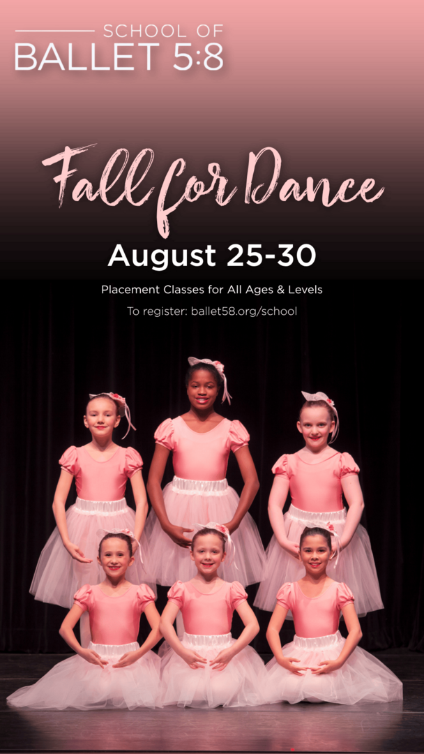 Join the School of Ballet 5:8 for Fall for Dance, a high-energy open house week designed for new and returning students. From August 25–30, enjoy $5 placement classes taught by professional ballerinas, exclusive back-to-school discounts, and fun prizes. New students can audition for the 2025-26 season, while current students are invited to get fitted for uniforms and meet the faculty. Whether you’re exploring ballet for the first time or returning to the studio, Fall for Dance is the perfect way to start your season.