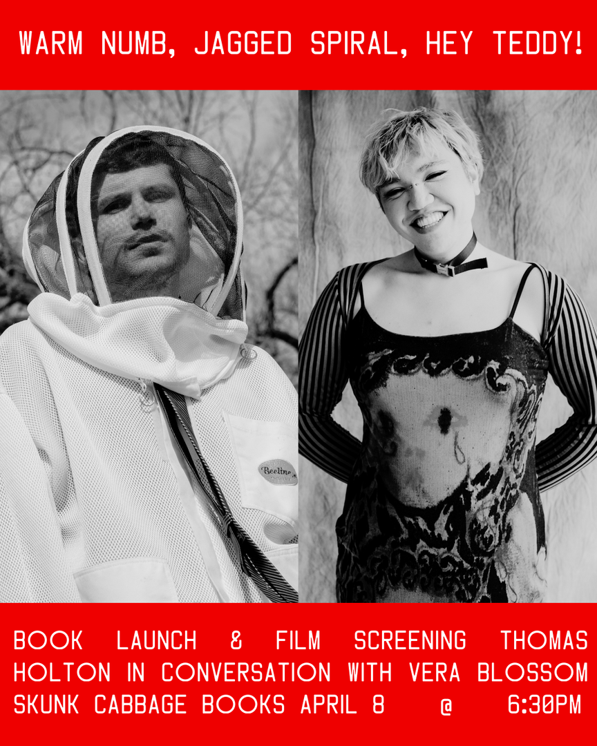 Join us for the release of Thomas Holton's new poetry chapbook and short film project, Warm Numb, Jagged Spiral, Hey Teddy! along with Vera Blossom.