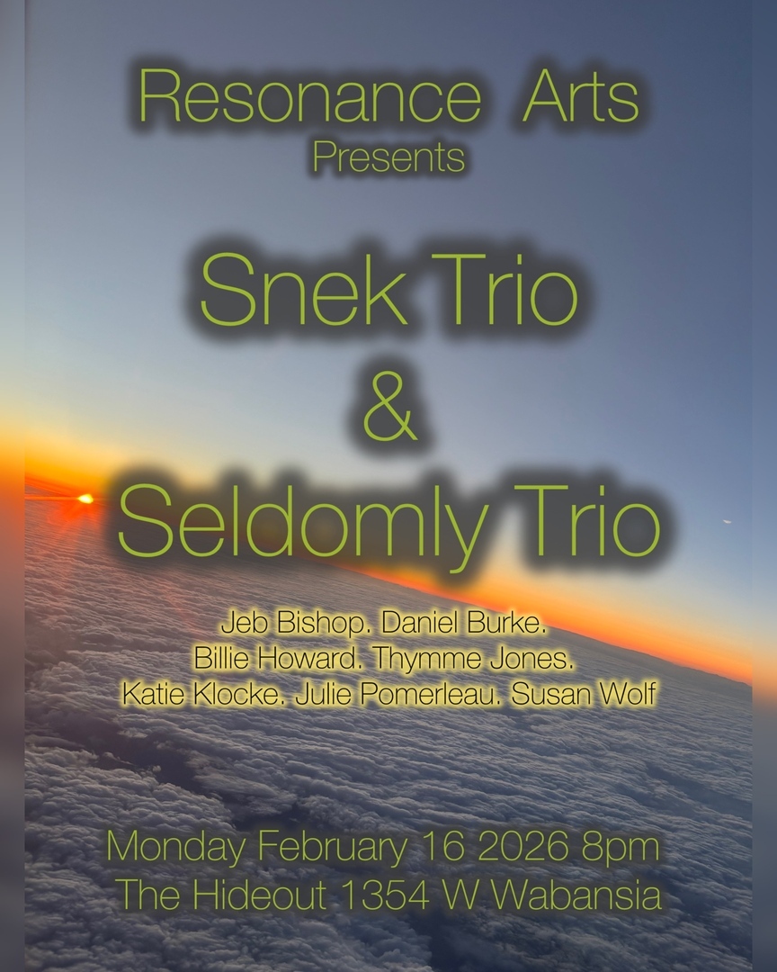 There was a time when we sought out music and sound to fill our every expanse. Now we crave silence and stillness, though divine chaos occasionally intervenes. This is improvisation with an ear toward the unknown, reaching out to connect with the ineffable. On this particular night we are Jeb Bishop, Daniel Burke, Billie Howard, Thymme Jones, Katie Klocke, Julie Pomerleau and Susan Wolf. File under post-rock/post-jazz/post-Everything/pre-Nothing. This trio is so seldom that it (more than) doubled.