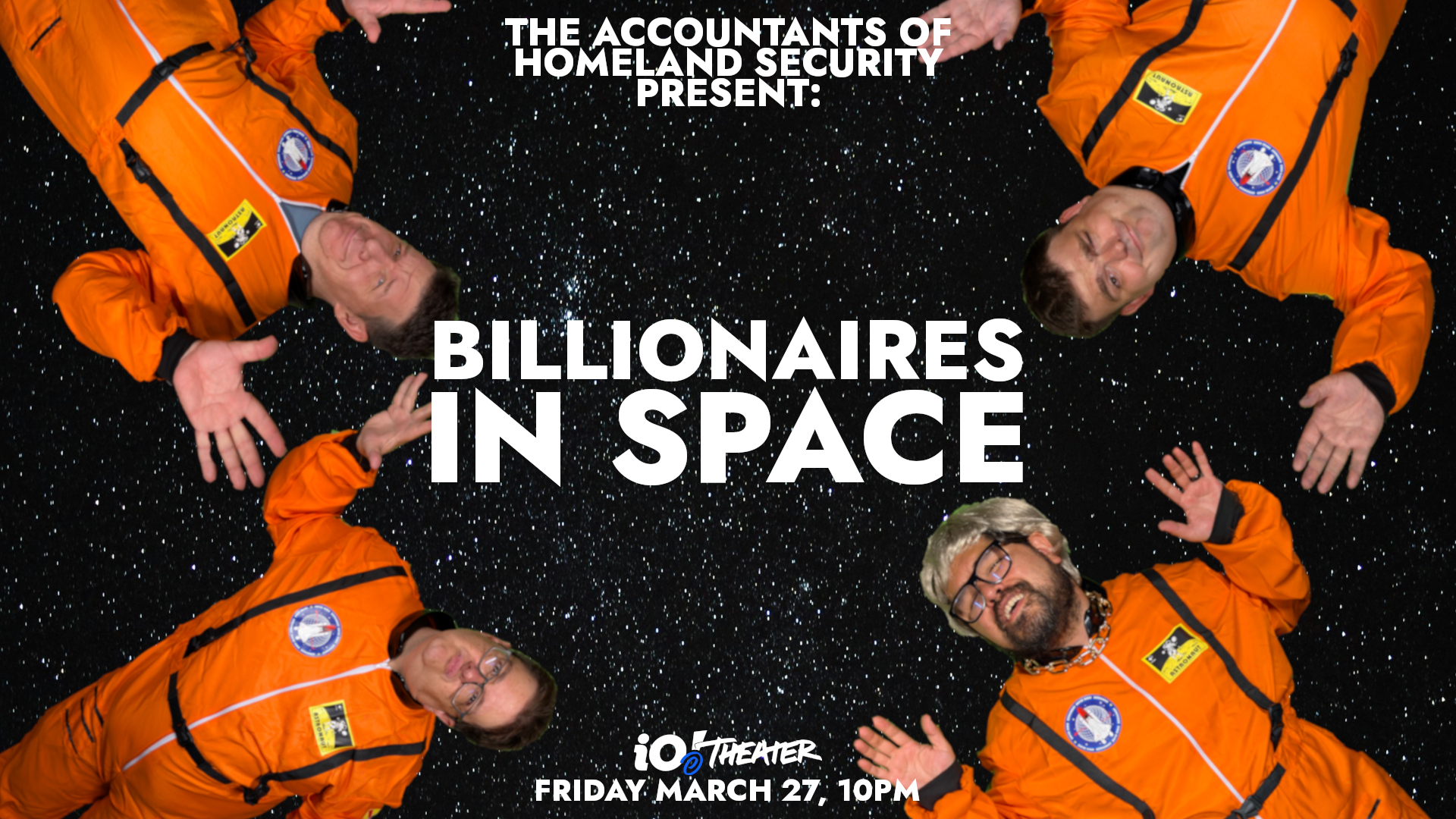 In Billionaires In Space, sketch comedy troupe The Accountants Of Homeland Security present a night of hysterical satirical sketches in which our nation’s oligarchs vacation off the planet Earth to escape the societal collapse caused by their greedy, selfish actions. This one-night-only multimedia show combining live comedy and pretaped video segments takes place March 27th at the iO Theater.