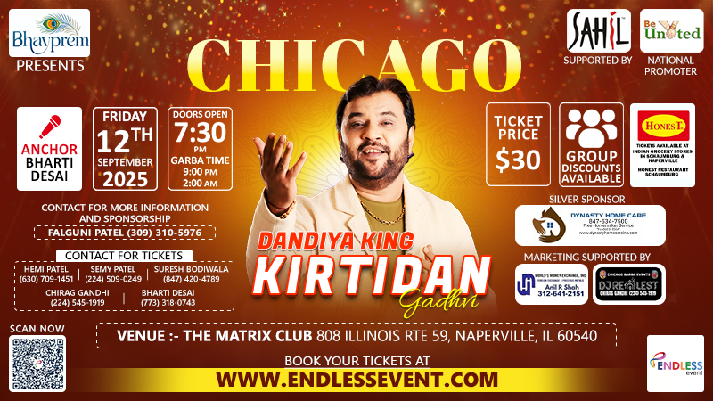 Get ready, Chicago! π Experience the magic of Navratri with the Dandiya King β Kirtidan Gadhvi, performing live at The Matrix Club, Naperville. Dance the night away to soulful Garba beats and high-energy dandiya tunes in the most vibrant festive celebration of the year.