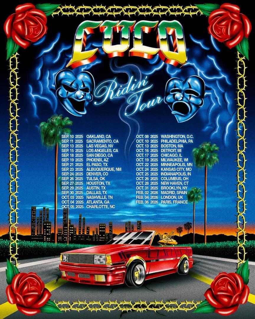 Cuco is hitting the road for his "Ridin" tour, following the release of his album Ridin on May 9. The new project leans into his signature mix of dreamy synths, bilingual lyrics, and mellow vibes. Now, he's bringing that sound to life on stage, connecting with fans across different cities as he performs songs from the album and past favorites.