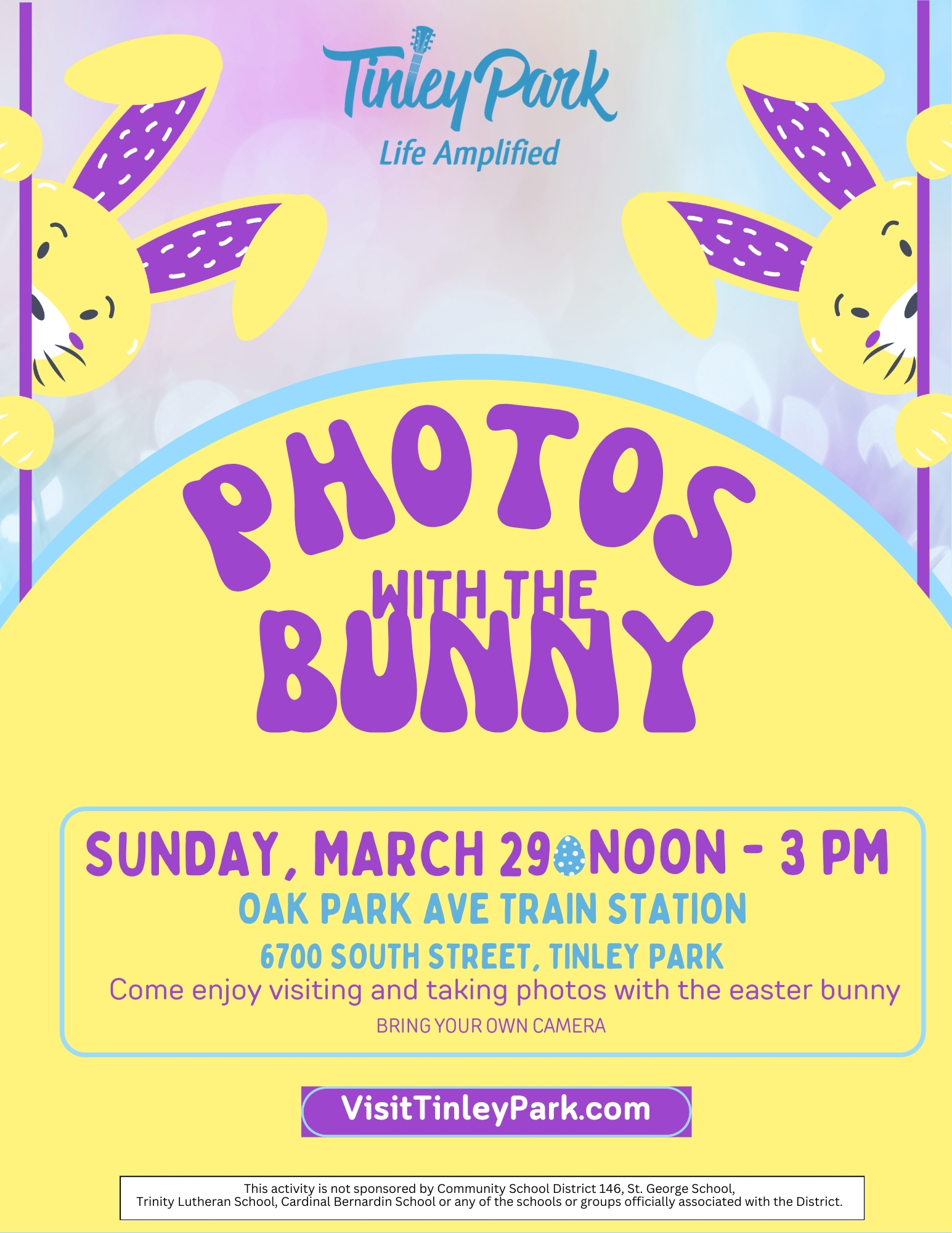 HomeEventsPhotos with the Bunny This Event has Passed Photos with the Bunny Sunday, March 29, 2026 11:00 AM - 2:00 PM 11:00 AM - 2:00 PM See all dates and Times Tinley Park Parking Deals Get a Ride LYFT UBER Add to Calendar 03/29/2026 11:00 AM 03/29/2026 02:00 PM America/Atikokan Photos with the Bunny Snap a photo with the Easter Bunny from noon to 3 p.m. on Sunday, March 29 at the Oak Park Avenue Train Station in Tinley Park. Don't forget to bring your own camera! Details & Tickets: https://www.upcomingevents.com/chicago/events/tinley-park/photos-with-the-bunny-619609?ref=uceaddevent Tinley Park, , Tinley Park, IL, Set Reminder Categories Holiday, Kids & Family View Event Website » Snap a photo with the Easter Bunny from noon to 3 p.m. on Sunday, March 29 at the Oak Park Avenue Train Station in Tinley Park. Don't forget to bring your own camera! Read More View Less
