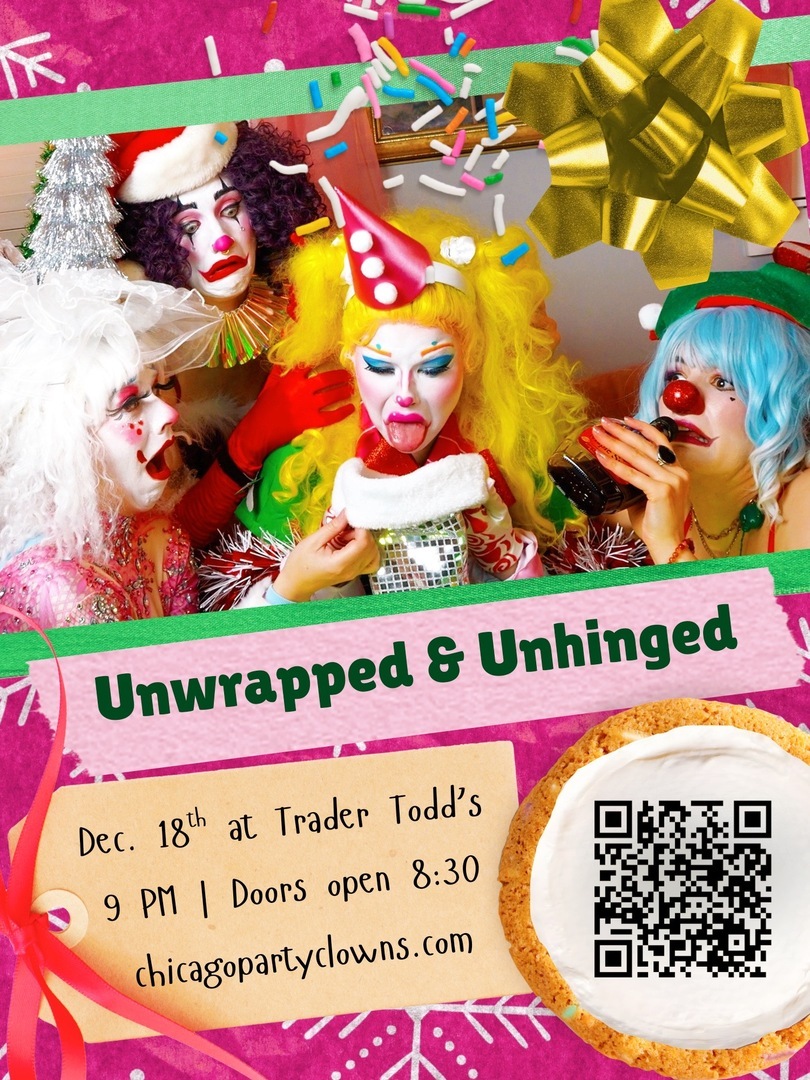 Join Swirly, Dollop, Sprinkles, and Trixie for a clown elf Christmas burlesque spectacular in the back of Trader Todd's.