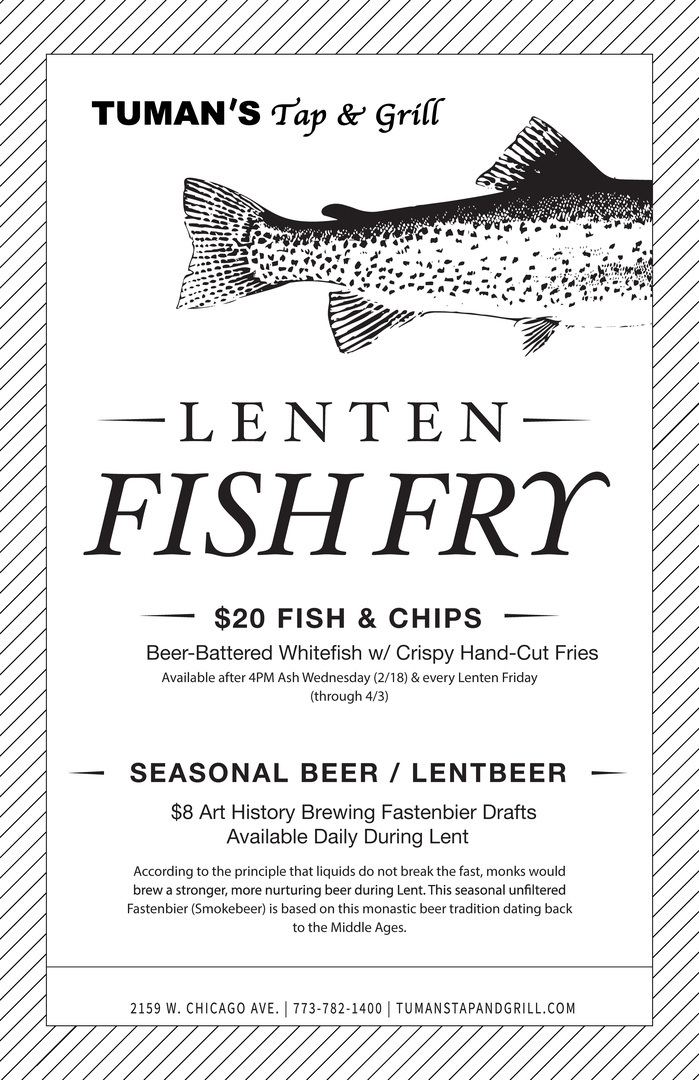 Tuman’s features a $20 Fish & Chips entrée, which includes beer-battered whitefish with hand-cut fries and house tartar sauce Ash Wednesday and every Lenten Friday through Good Friday. The special is available from 4-10 p.m. Ash Wednesday and from 4-10 p.m. on Lenten Fridays through April 3.