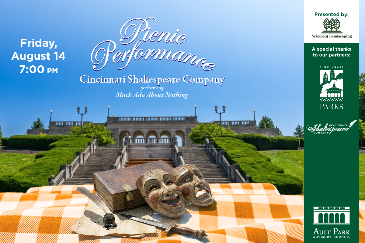 Join us, and our presenting sponsor, Wimberg Landscaping, at the base of the Cascade Fountain, for an evening of Shakespearian comedy in the beauty of Ault Park where the Cincinnati Shakespeare Company will perform Much Ado About Nothing. Bring a blanket or chairs and a picnic dinner to enjoy an evening of fun.