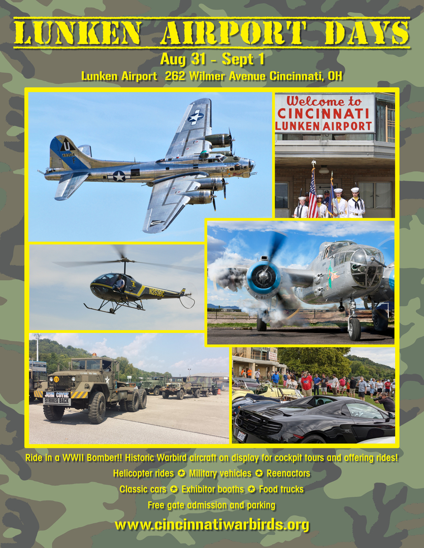 Cincinnati Warbird's annual Lunken Airport Days Open House over Labor Day weekend featuring RIDES and TOURS in historic WWII military aircraft. This year the rare B-17 "Sentimental Journey" and B-25 "Maid in the Shade" make their debut appearance here in Cincinnati. Other historic aircraft will also be on display plus helicopter rides, classic cars, military vehicles, exhibits, vendors, food trucks, and a patriotic flag ceremony at 12N both Saturday and Sunday. A great family event with FREE admission and parking.