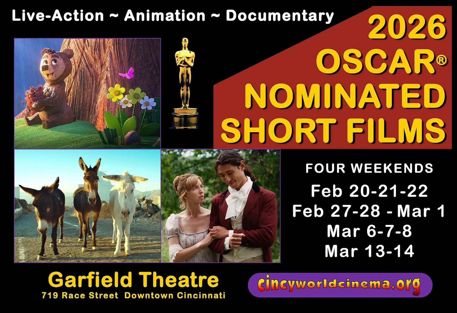The programs feature all nominated and Oscar winning short films, presented exclusively at the Garfield Theatre, 719 Race St., downtown. The Documentary shorts program screens on Fridays at 6:30 pm. The Animation program screens on Saturday and Sunday at 3:30 pm. The Live-Action programs screens on Saturday and Sunday at 6:30 pm. Dinner discounts for CWC patrons are offered by the Butcher & Barrel and Shanghai on Elm restaurants. There are 2,100 garage and surface lot parking spaces within 1.5 blocks of the theatre.
