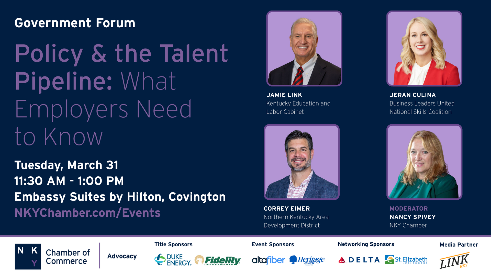 Access to talent remains the top issue facing our business community. Join us for a policy-driven conversation on how decisions in Frankfort and Washington are shaping workforce development and the pipelines employers and workers rely on. You’ll hear how the Chamber is representing Northern Kentucky businesses, where we are engaging with lawmakers, and what progress is being made to ensure policy solutions match real workforce needs.