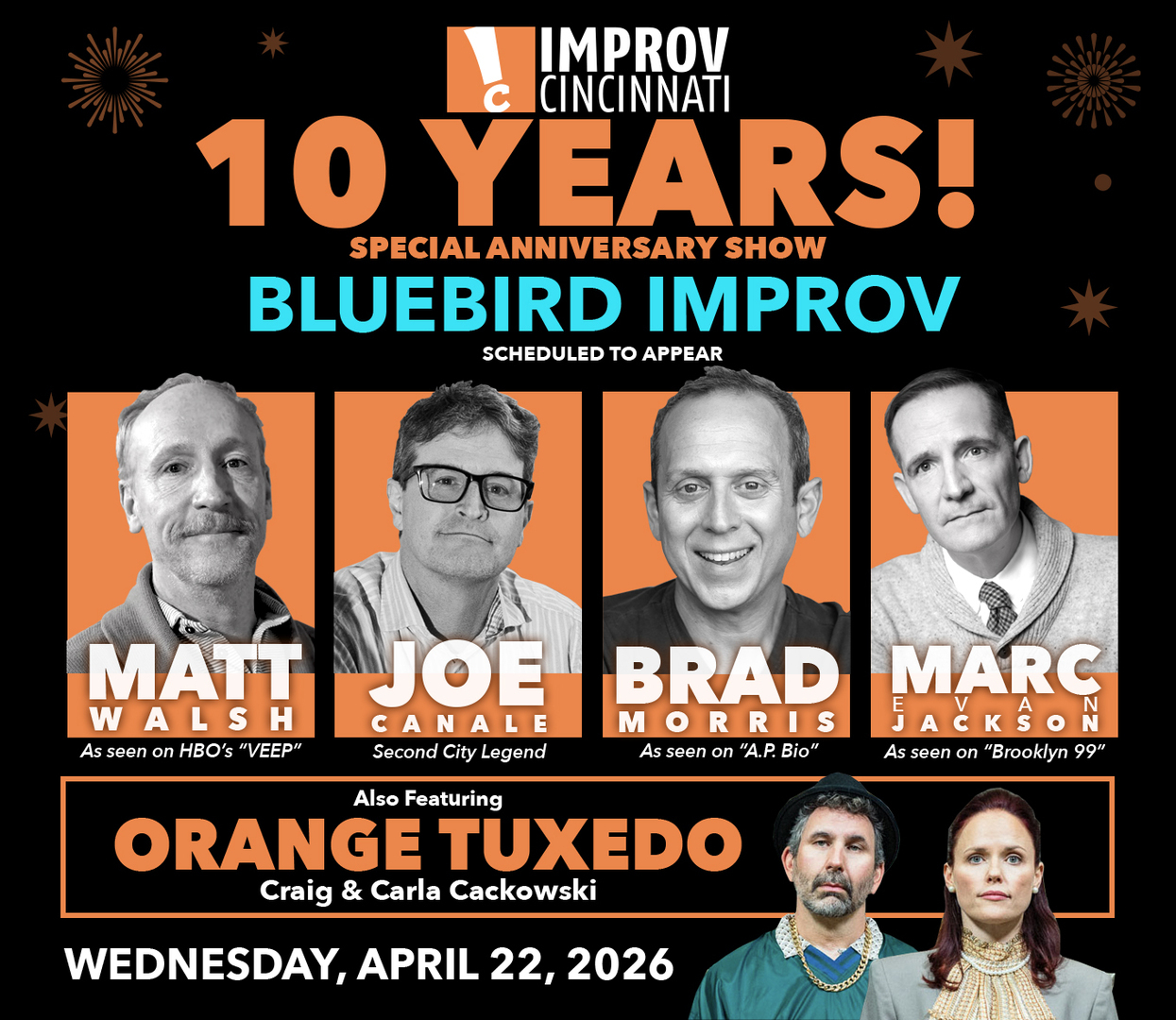 Improv Cincinnati celebrates ten years of bold, theatrical improv and sketch comedy with a one-night-only anniversary event. Joining the celebration are internationally touring improv powerhouses Bluebird and the Los Angeles duo Orange Tuxedo for an unforgettable night of once-in-a-lifetime comedy.
