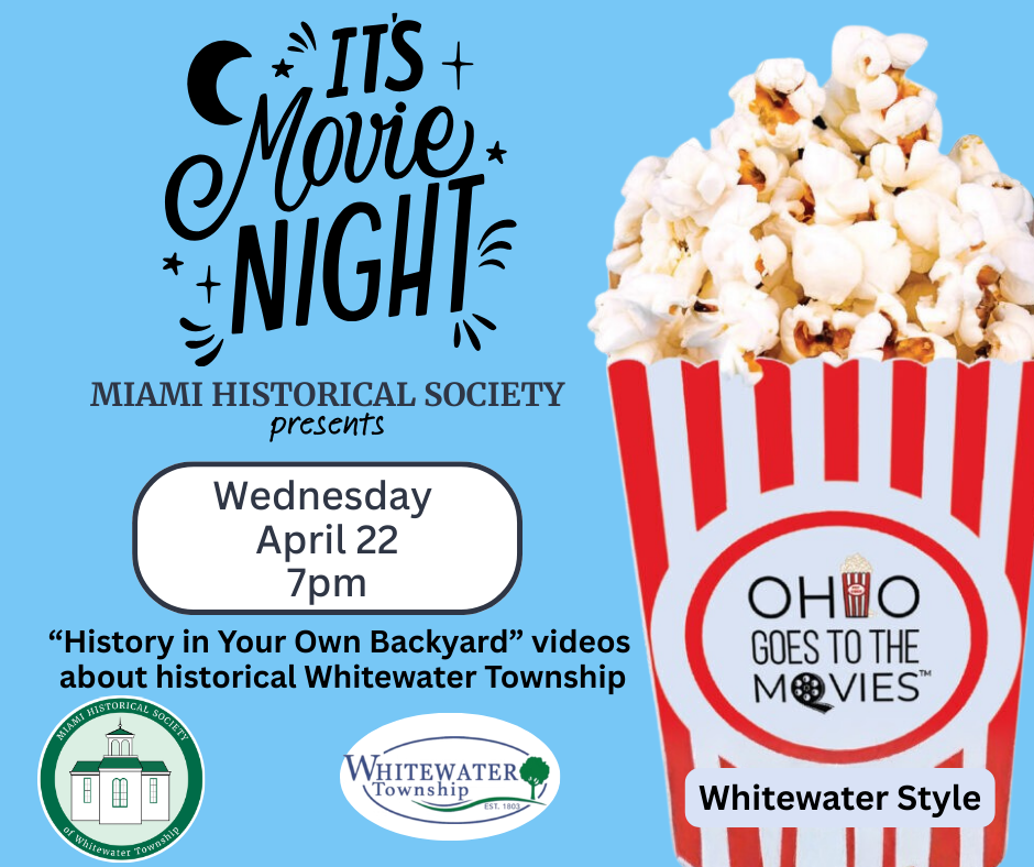 Lights, camera, local history! As part of Ohio Goes To The Movies, the Miami Historical Society of Whitewater Township presents “History in Your Own Backyard” movies all about Whitewater Township. Join us Wednesday, April 22, 2026—mix and mingle at 6 p.m., You are invited to explore our newly updated museum displays, including our beloved historic flag and quilt. Movies begin at 7 p.m. We hope you’ll share a special memory of Whitewater Township and help us celebrate the people and places that shaped our community.