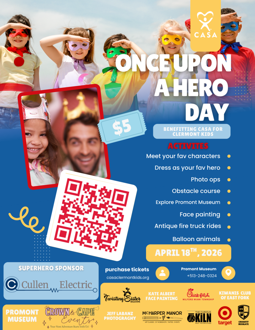Once Upon a Hero Day - Join us for a magical family event at Promont Museum celebrating heroes, heroines, and princesses. Children are invited to dress as their favorite character, meet costumed heroes, enjoy photo opportunities, face painting, an obstacle course, and hands-on fun throughout the museum. Tickets are $5 per child and include superhero photos, a goody bag, and refreshments. Proceeds benefit CASA for Clermont Kids.