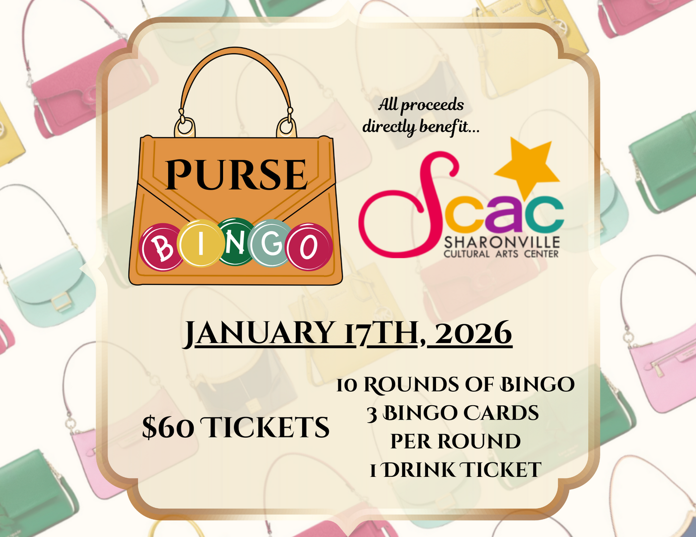 Join the Sharonville Cultural Arts Center for our annual Purse Bingo fundraiser event on January 17th. Designer purses, mimosas, bingo games, and lots of fun to support the Sharonville Cultural Arts Center. Tickets are $60 and include 10 rounds of bingo, 3 bingo cards per round, and 1 drink ticket. Extra bundles are available for purchase day of!