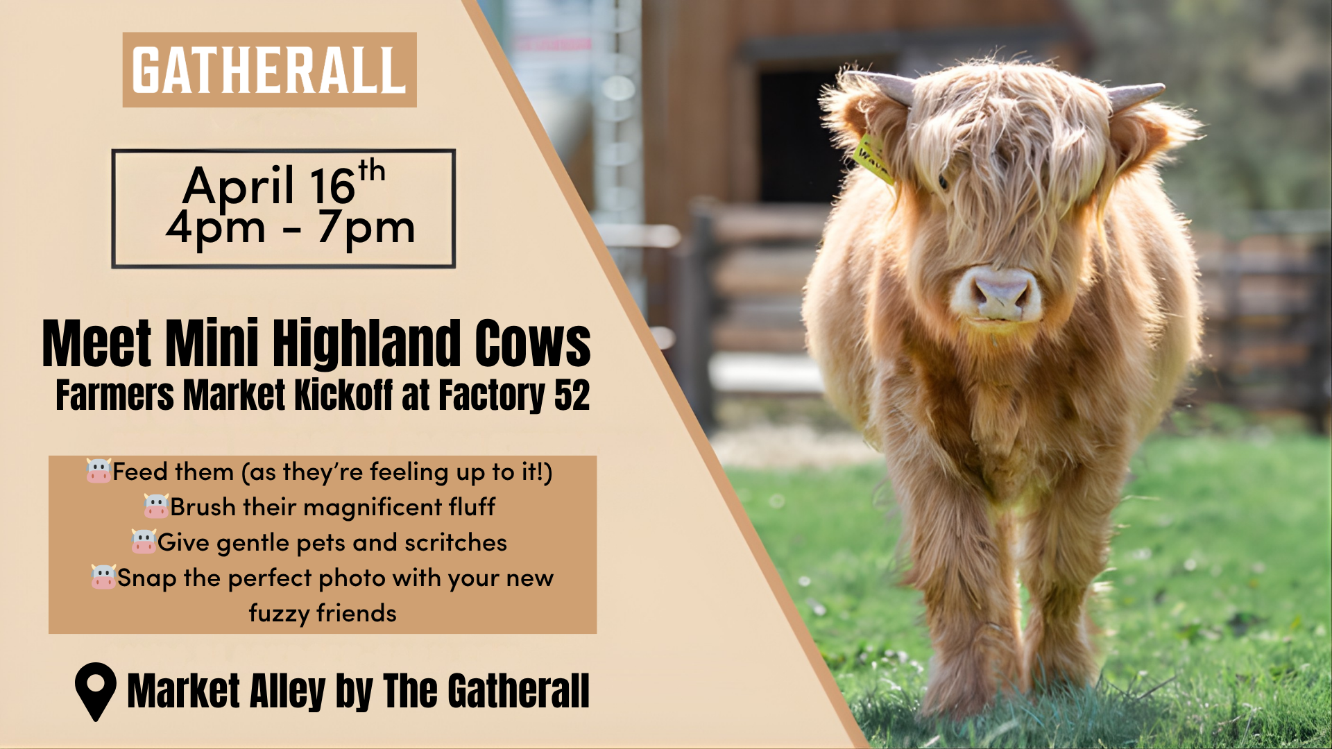 Market Alley is getting an extra-fluffy upgrade on Thursday, April 16 from 4PM–7PM with a visit from mini Highland cows — yes, the tiny, shaggy sweethearts of your dreams.