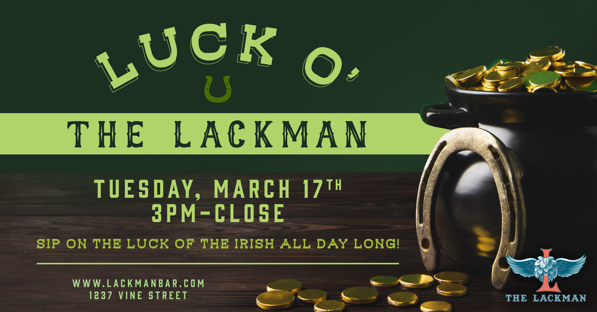 Get lucky at The Lackman this Tuesday, March 17th, and celebrate St. Patrick’s Day with drink specials and festive sips flowing all day long.