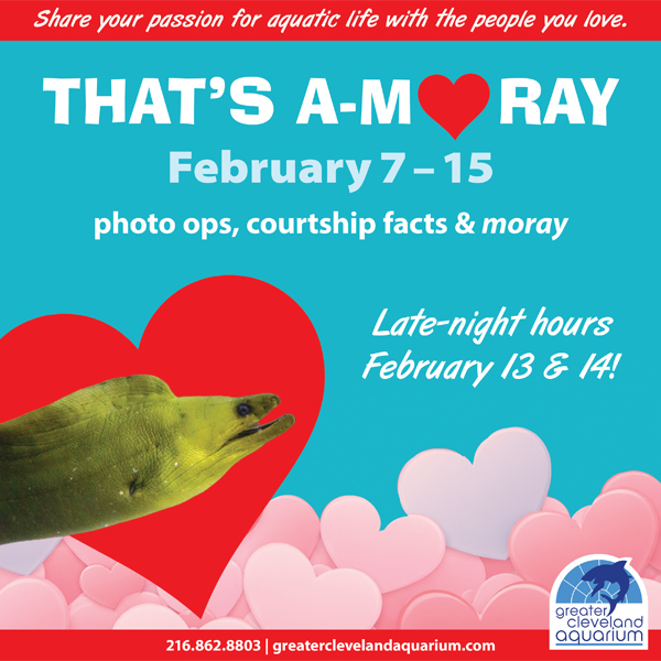 Weedy seadragons dance, red-eared slider turtles flutter, poison dart frogs trill and damselfish signal jump to attract mates. Love is in the air AND underwater, so add a splash of romance to a wintry February weekend. Your That’s A-Moray visit includes a romance-themed “I Spy” challenge, animal courtship facts, oversized cards and a little mood music. Make a date to celebrate Valentine’s Day week at Greater Cleveland Aquarium and share your passion for aquatic life with a partner, a friend or your family.