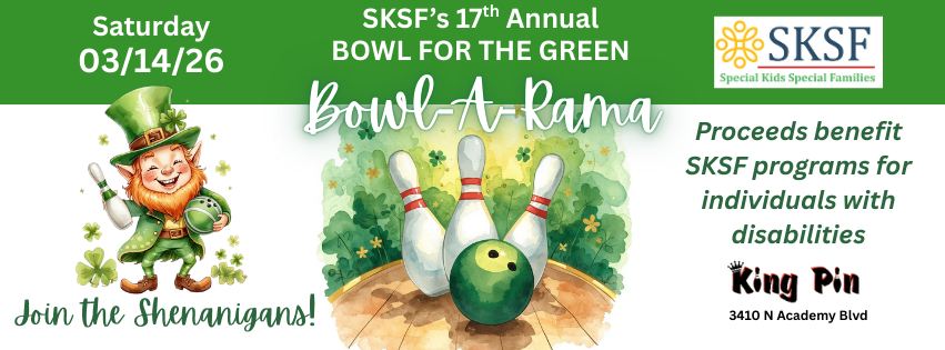 Special Kids Special Families will hold its 17th annual Bowl for the Green Bowl-A-Rama fundraiser at King Pin Lanes on 3410 N Academy Blvd on Saturday, March 14th from 2:00-4:30pm. Because it’s St. Patrick’s Day themed, we encourage bowlers to don their Irish green. The Colorado Springs community, SKSF clients, staff, and local businesses look forward to this event every year. All proceeds will help support SKSF programs for individuals with developmental disabilities and their families. Contest and drawing prizes will be awarded throughout the event. Form your team up to 5 bowlers and register online. Lanes are limited so sign up your team today! Please help support a great cause and have fun while doing it! All ages and abilities are welcome - $40/person or $20/child (15 & under).