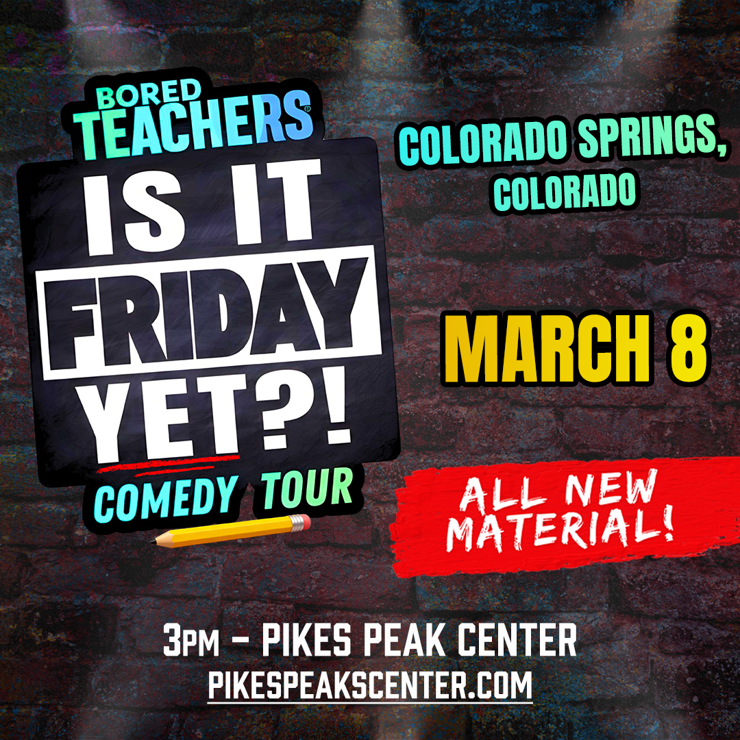 The funniest teacher-comedians on the planet are back with brand-new material, bigger laughs, and a fresh round of classroom-inspired chaos on the Bored Teachers “Is It Friday Yet?!” Comedy Tour. Sunday, March 8, 2026, they will be in Colorado Springs at the Pikes Peak Center.