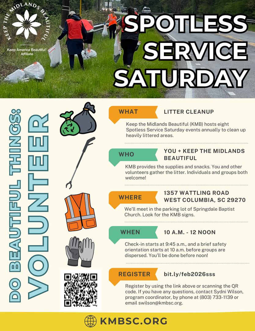 Individuals and groups both welcome! We’ll meet in the parking lot of Springdale Baptist Church. Look for the KMB signs. Check-in starts at 9:45 a.m., and a brief safety orientation starts at 10 a.m. before groups are dispersed. You’ll be done before noon! Register by using the link above or scanning the QR code. If you have any questions, contact Sydni Wilson, program coordinator, by phone at (803) 733-1139 or email [email protected]. bit.ly/feb2026sss
