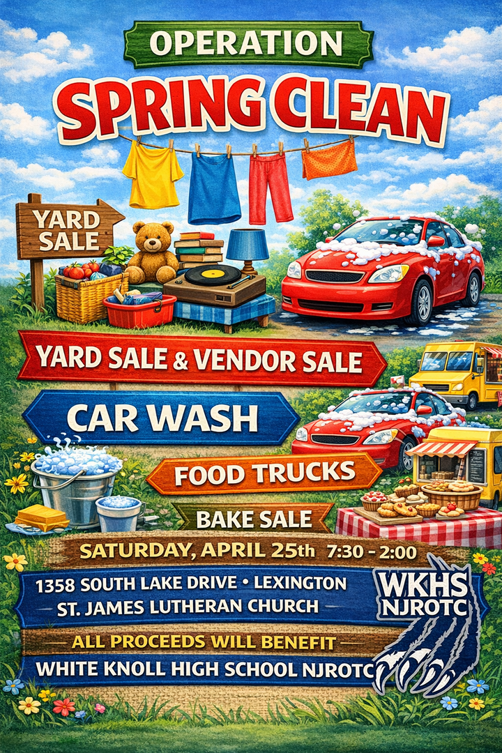 HomeEventsOperation Spring Clean Operation Spring Clean Saturday, April 25, 2026 7:30 AM - 2:00 AM 7:30 AM - 2:00 AM See all dates and Times 1358 S Lake Dr Parking Deals Get a Ride LYFT UBER Add to Calendar 04/25/2026 07:30 AM 04/26/2026 02:00 AM America/Anguilla Operation Spring Clean The White Knoll High School NJROTC will host Operation Spring Clean - a car wash, yard sale, vendor sales, and bake sale. Details & Tickets: https://www.upcomingevents.com/columbia/events/1358-s-lake-dr/operation-spring-clean-639197?ref=uceaddevent 1358 S Lake Dr, 1358 South Lake Drive, Lexington, SC, 29073 Set Reminder Categories Charities, Good For Families, Kids & Family, Neighborhood The White Knoll High School NJROTC will host Operation Spring Clean - a car wash, yard sale, vendor sales, and bake sale.