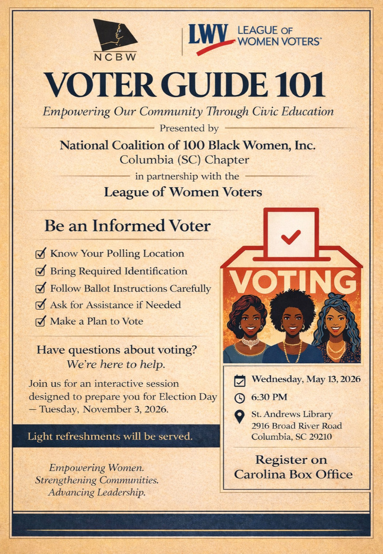 Join the National Coalition of 100 Black Women, Inc., Columbia (SC) Chapter in partnership with the League of Women Voters for Voter Guide 101, an interactive civic education session designed to help community members prepare for Election Day. Participants will learn how to locate their polling place, understand voter ID requirements, follow ballot instructions, and develop a personal voting plan. The session will include guided discussion, opportunities to ask questions, and helpful resources to support informed civic participation.Light refreshments will be provided.Registration is required through Carolina Box Office.