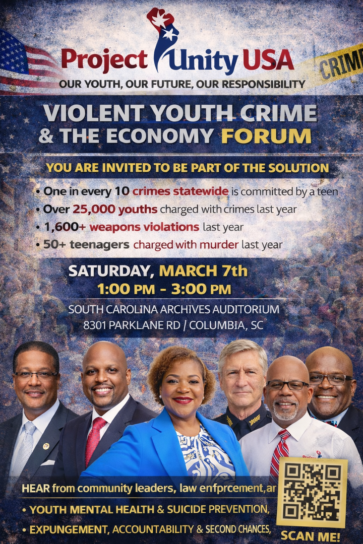 The South Carolina Youth Violence & the Economy Forum, hosted by Project Unity USA, is a statewide, solutions-focused community forum addressing the growing crisis of violent youth crime and its impact on public safety, families, and economic stability across South Carolina.