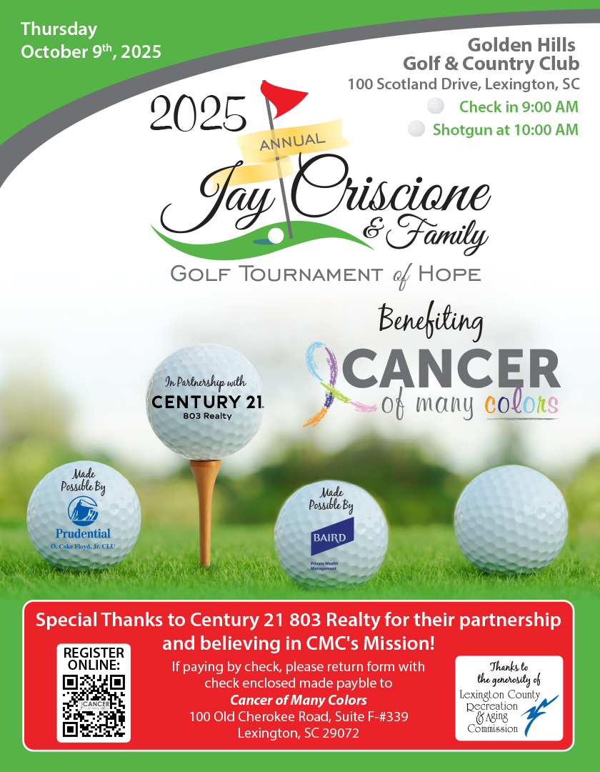 Mark Your Calendars!!! The Jay Criscione Golf Tournament is back this October 9th, and we can't wait to see you there! This special event raises critical funds for Cancer of Many Colors, helping cancer patients with basic living expenses while they undergo treatment.