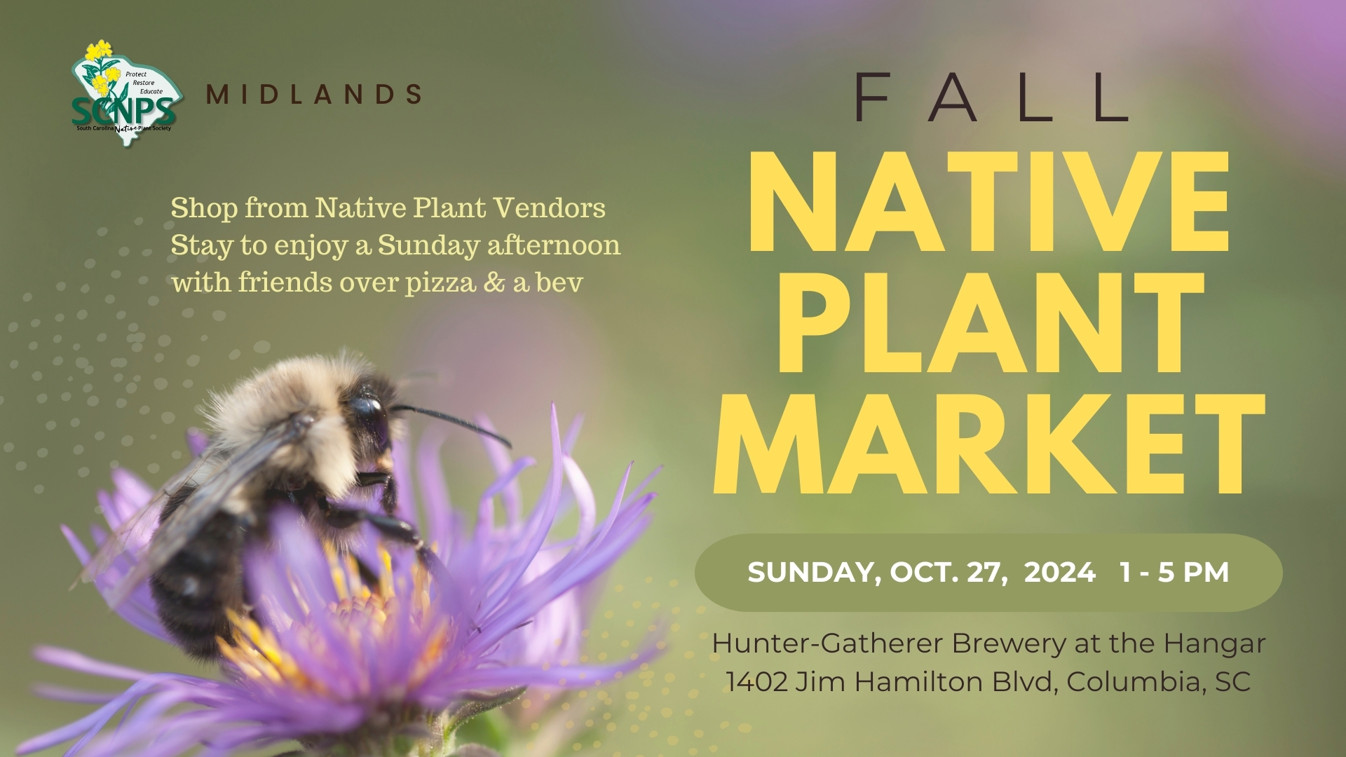Fall is the best time for planting, and native plants are the best thing for South Carolina bees, butterflies, and all wildlife! Come shop for beautiful plants for your gardens at the Hangar, and hang around for pizza and a beverage. Our sale is a little different this year, with vendors Native Plants to the People and Native Plants by Annette. Come support these South Carolina women-owned businesses!