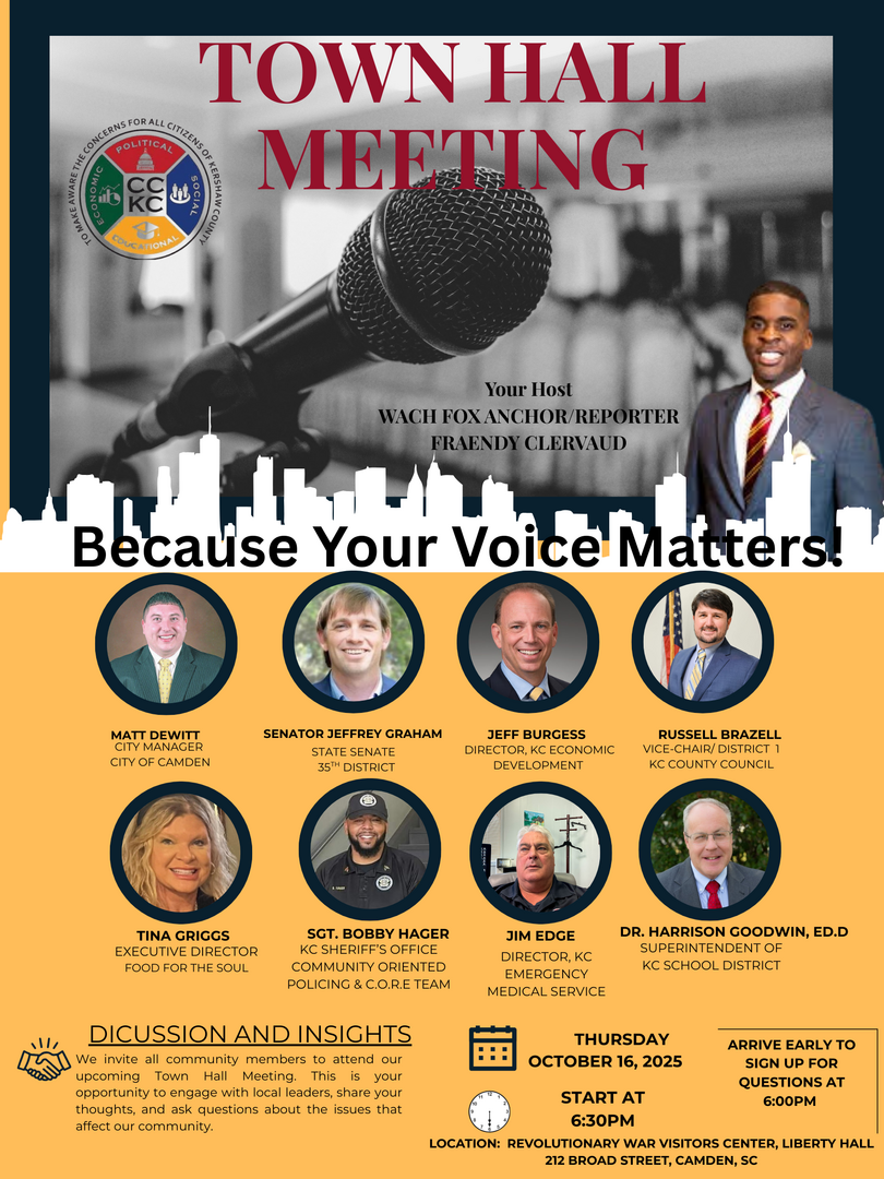 The community is invited to attend the 4th highly successful Town Hall Meeting on October 16th and share their thoughts and concerns with local leaders Matt DeWitt/Camden City Manager; Russell Brazell/Vice Chairman KC County Council; SC Senator Jeffrey Graham/District 35; Jeff Burgess/KC Economic Development Director; Tina Griggs/Food for the Soul Executive Director; Sgt. Bobby Hager/KC Sheriff's Office Community Oriented Policing; Jim Edge/KC Emergency Medical Service Director, and Dr. Harrison Goodwin/KC School District Superintendent. Those wanting to submit a written question regarding community issues are asked to sign up at 6 pm.