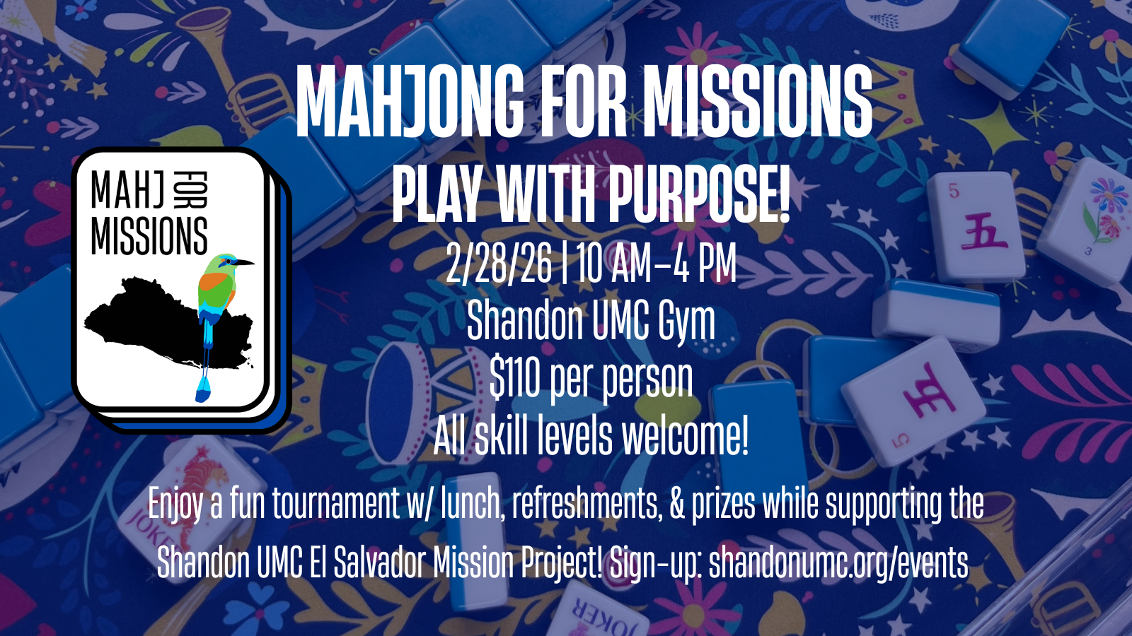 Join Shandon UMC for Mahjong for Missions. This event supports our annual El Salvador Mission Project, which serves the communities of Ahuachapán. Of your entry fee, $100 goes directly to the mission fund, and $10 covers lunch. Proceeds help support construction projects, a week-long Vacation Bible School, and food bag distribution while building meaningful relationships and sharing God’s love with families we serve.