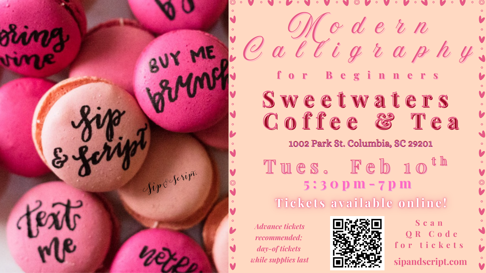 Join us at Sweetwaters Coffee & Tea in Columbia, South Carolina for a festive workshop of Valentine’s/ Galentine’s fun and pretty lettering for beginners! Whether you’re a stationery nerd, DIY Bride-to-be, or just a crafty individual, in this workshop you’ll be learning an introduction to modern calligraphy with a pointed dip pen and ink. We will cover all the basics and get you ready to add those special lettered details to your Valentine’s/ Galentine’s cards. The perfect crafty night out!