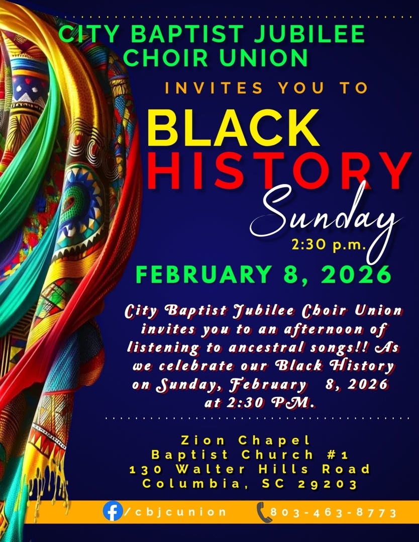 The City Baptist Jubilee Choir Union invites you to our Monthly Union Session on Sunday, February 8, 2026, at 2:30 PM at Zion Chapel Baptist Church #1, located at 130 Walter Hills Road, Columbia, SC 29203.