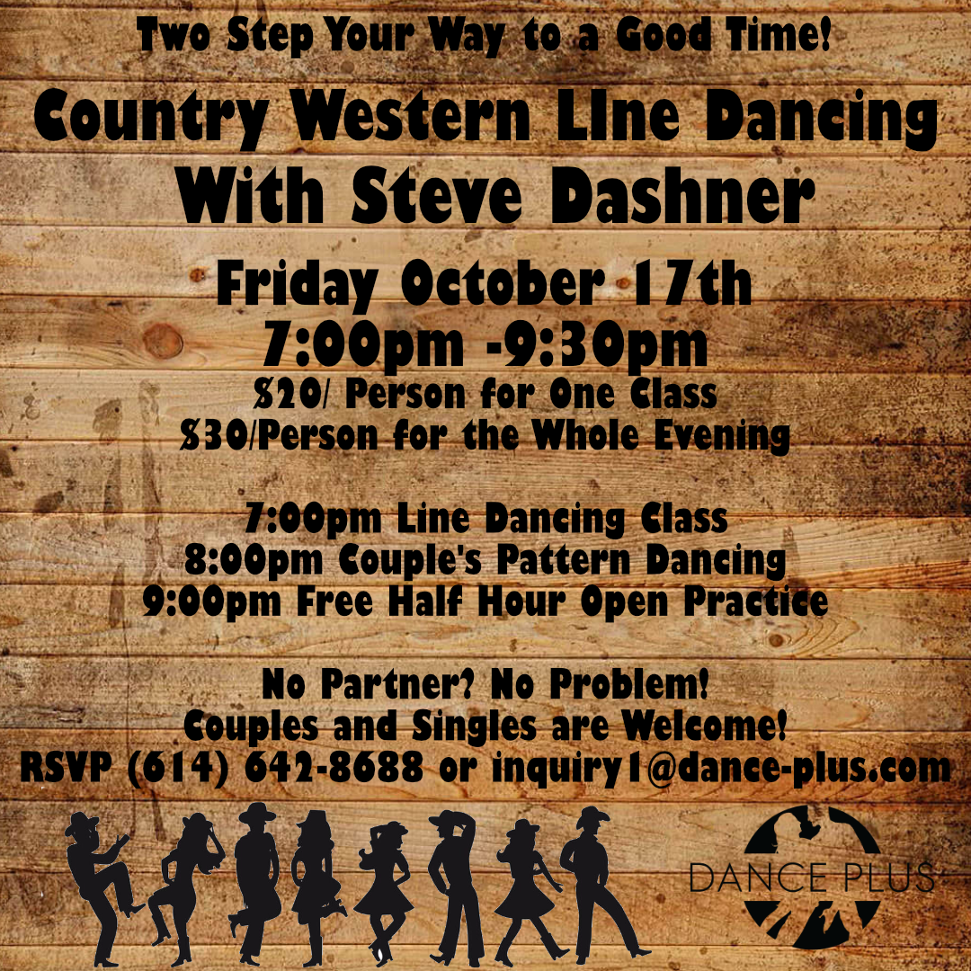 Howdy, y'all! Kick up your heels at the Dance Plus Country and Western Night on Friday, October 17 from 7p-9:30p. Join us for an evening of line dancing and two-stepping.