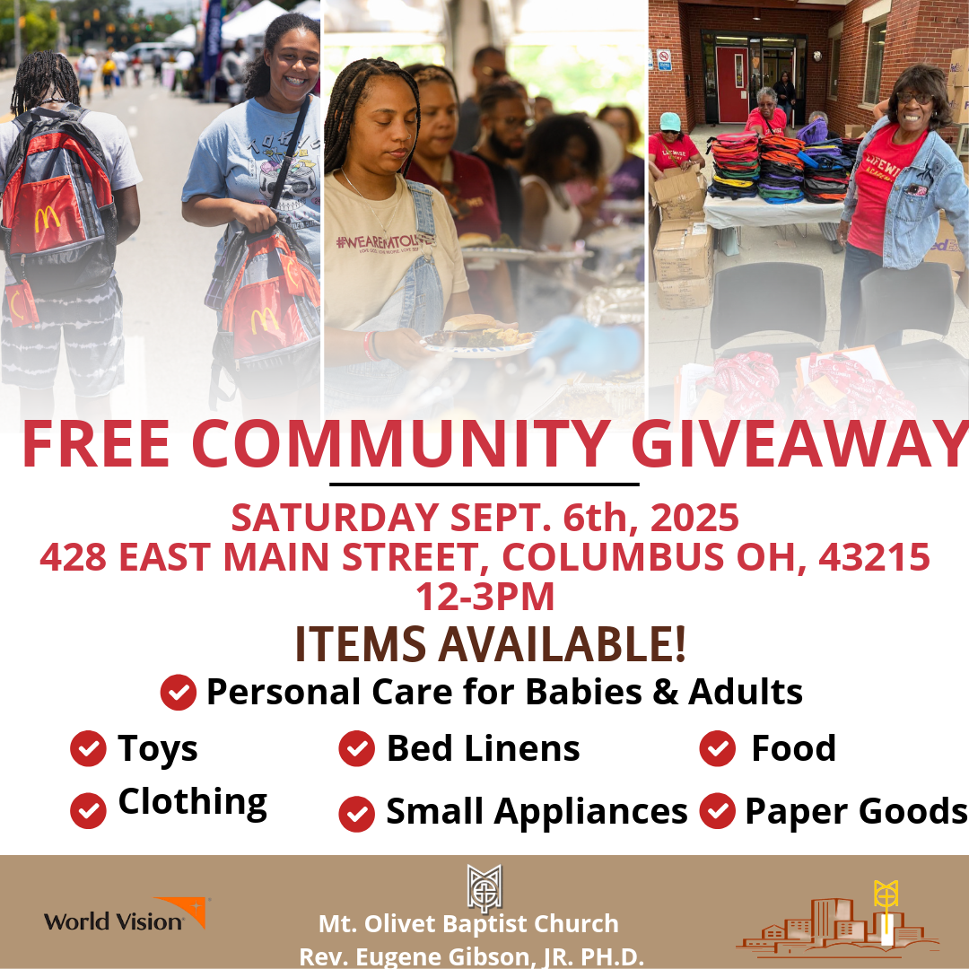 Mt. Olivet Baptist Church, led by Rev. Eugene Gibson, Jr., Ph.D., is partnering with World Vision to host a Free Community Giveaway on Saturday, September 6, 2025, from 12–3 PM at 428 E. Main Street, Columbus, OH 43215.