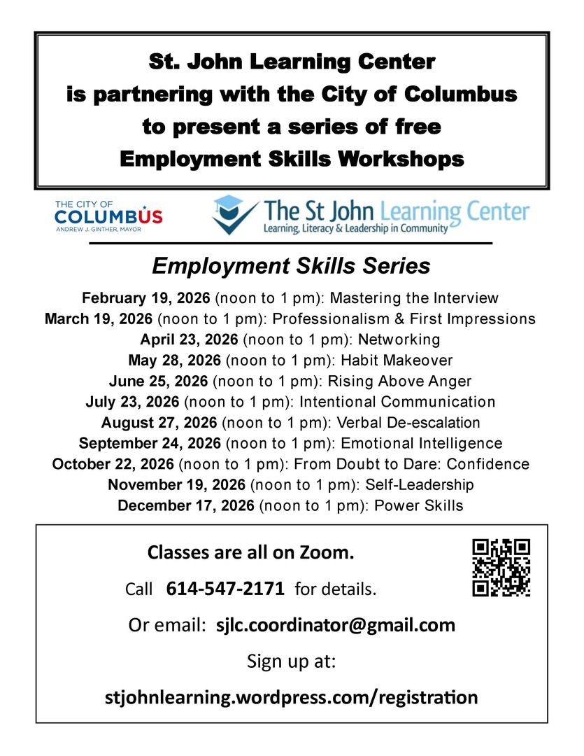 Be sure to follow us on our website (stjohnlearning.wordpress.com) or on Facebook (facebook.com/stjohnlearning) to keep up with our personal finance workshops, Start Your Own Business series, Stop the Stigma mental health series, and more. St. John Learning Center also offers G.E.D. classes. Call 614-547-2171 for details.