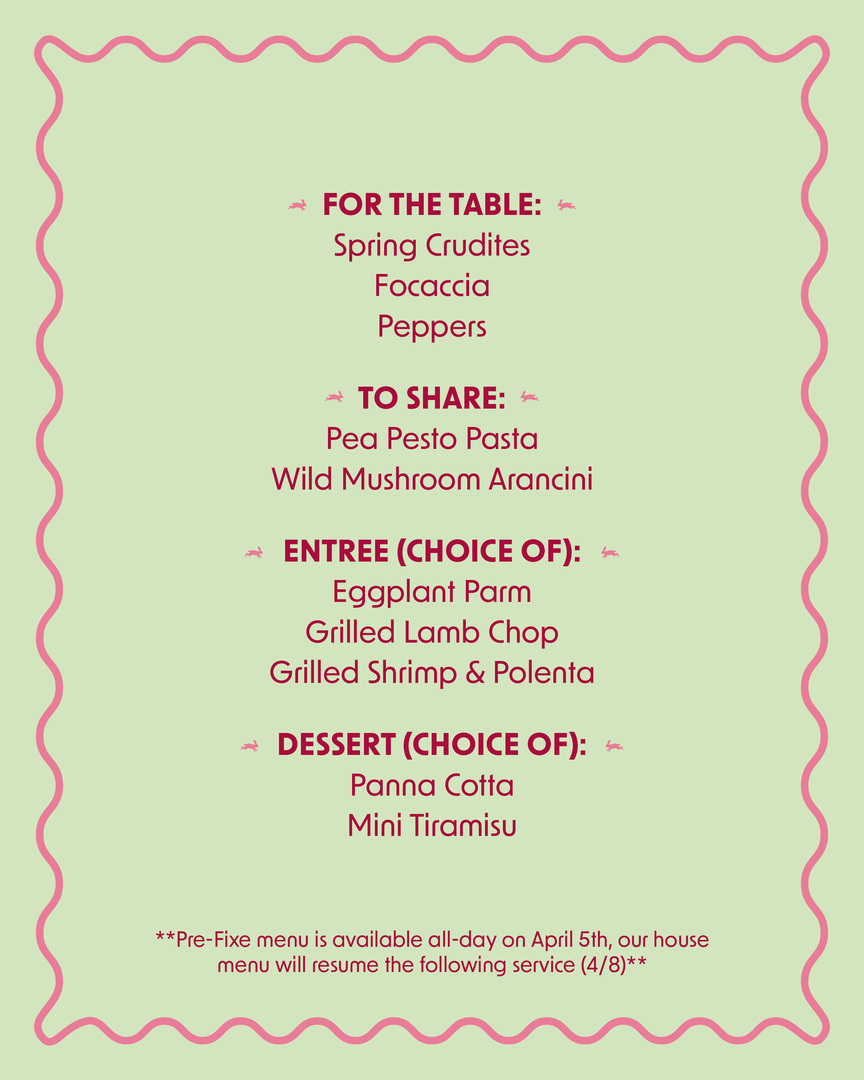 Enjoy a prix-fixe menu with dishes like pea pesto pasta, grilled lamb chop, wild mushroom arancini and mini tiramisu. Reservations are open now!