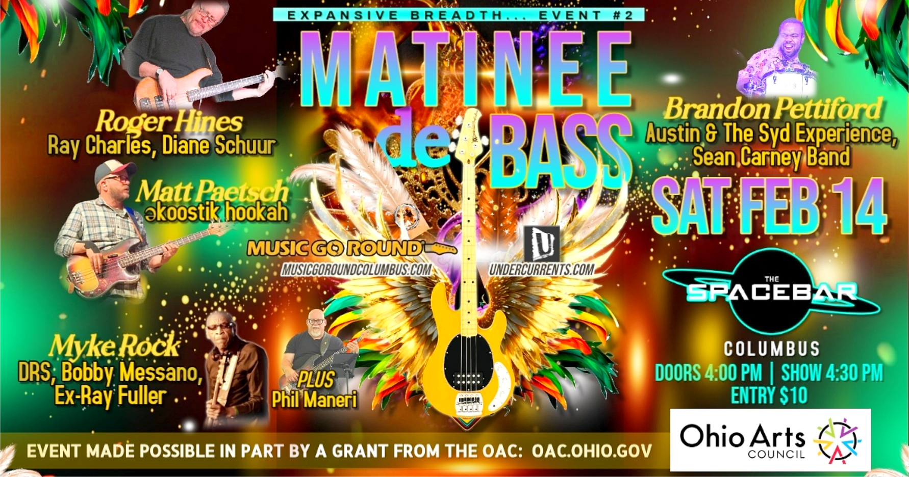 On Saturday, February 14th, 2026, the "Expansive Breadth of Electric Bass Guitar in Action" series presents its 2nd of 4 events at the Spacebar (2590 N High St, Columbus, Ohio: https://www.facebook.com/spacebarcolumbus, https://www.spacebarcolumbus.com), beginning at 4:30 PM. This special Valentine's Day concert is subtitled, Matinee de Bass and features central Ohio bassists Roger Hines (Ray Charles, Diane Schuur, Louie Bellson, Count Basie Orchestra: https://rogerhinesbass.com), Matt Paetsch (əkoostik hookah, Wally Mitchell, Matt Adams QT, Jen Miller: http://www.ekoostik.com, http://www.facebook.com/matt.paetsch), Myke Rock (Jamal Thomas - SOS Band, Maceo Parker -, Bobby Messano Band, Dirty Red Sunshine), and drummer Brandon Pettiford (Austin and the Syd Experience, Pett Crow, Sean Carney Band: https://soundcloud.com/brandon-pettiford-867083167) on the Music Go Round -Columbus- Stage (http://www.musicgoround.com/locations/columbus-oh). Phil Maneri (Drumzand Wires, The Alsatian Queen: https://maneri.net) opens the show. Undercurrents (http://www.undercurrents.com, Gabor Klein) is a co-sponsor of the series.