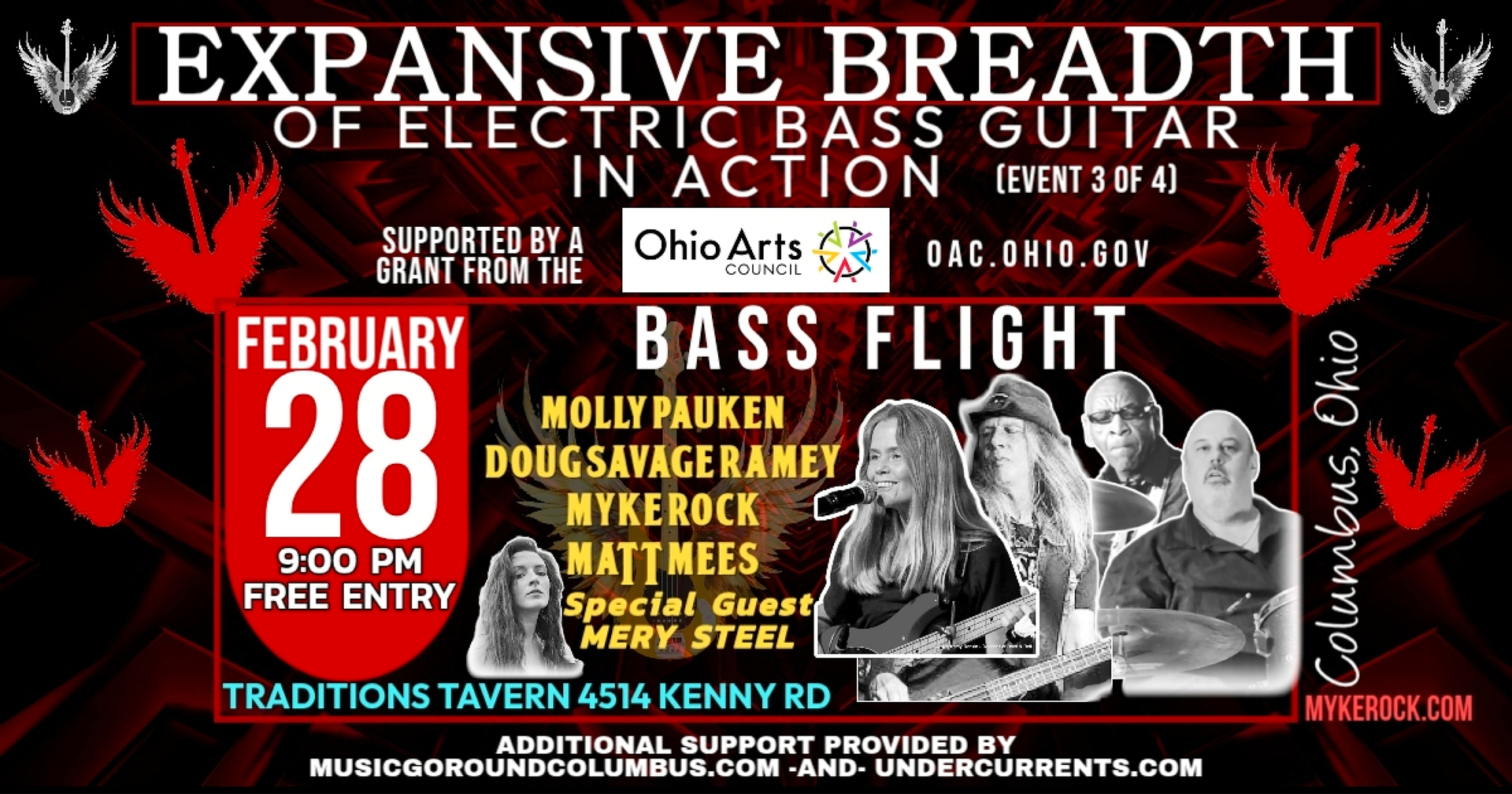 On Saturday, February 28th, 2026, the "Expansive Breadth of Electric Bass Guitar in Action" series has its 3rd of 4 events at Traditions Tavern (4514 Kenny Rd, Columbus, Ohio, Jt Henry), beginning at 9:00 PM. This free concert exhibits the full breadth of electric bass guitar, highlighting the many intriguing ways the instrument can be used. The third deposit in the event series is subtitled Bass Flight and features central Ohio bassists Molly Pauken (McGuffey Lane, Sirens, John Schwab Band: http://mollypauken.com), Doug "Savage" Ramey (The Godz, Vaudville, Nasty Action, Pink Velvet Krush: https://www.facebook.com/doug.s.ramey, https://www.thegodzusa.com), Myke Rock (Jamal Thomas - SOS Band, Maceo Parker -, Bobby Messano Band, Dirty Red Sunshine: http://www.mykerock.com), and drummer Matt Mees (Ex-The Godz, Bo Diddley, The Remedies, Scott Gorsuch, Mervana) on the Music Go Round -Columbus- Stage (http://www.musicgoround.com/locations/columbus-oh). Singer-songwriter, Mery Steel (Mery Steel: http://www.merysteel.com) opens the show. Undercurrents (http://www.undercurrents.com, Gabor Klein) is a co-sponsor of series. Check out the Ohio Arts Council grant description and artists' information, bio and links at http://www.mykerock.com/tour-events/2899737_expansive-breadth-of-electric-bass-guitar-in-action-3-4-bass-flight-sat-feb-28-9-00-pm-at-traditions-tavern-columbus-an-oac-grant-supported-event -OR- visit www.mykerock.com