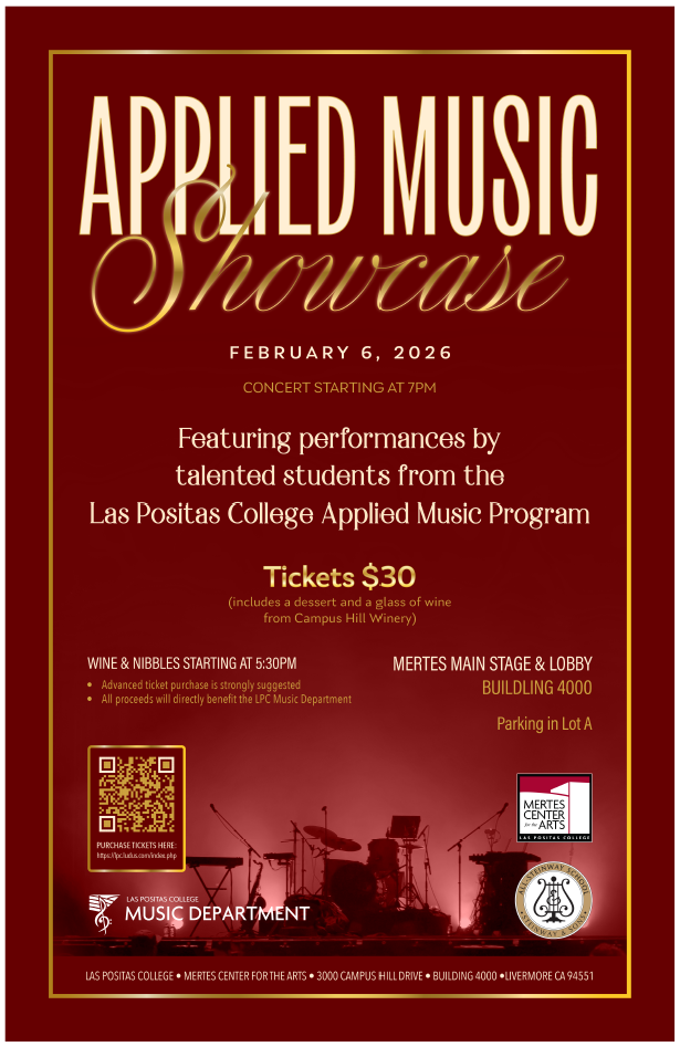 Wine and Nibbles starting at 5:30pm. Advanced ticket purchase is strongly suggested. All proceeds will directly benefit the LPC Music Department. This event will take place at the Las Positas College Mertes Center for the Arts (Building 4000). Parking Lot A will be available.
