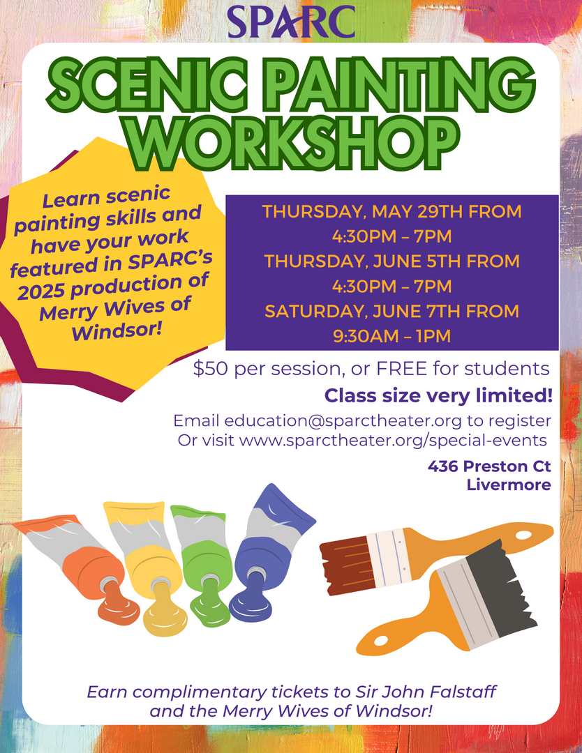 Join SPARC Theater’s Scenic Painting Workshop and help paint the actual set for our upcoming summer production of Sir John Falstaff and the Merry Wives of Windsor! This is not just a workshop—it’s a chance to be part of the team that brings the world of Shakespeare to life.