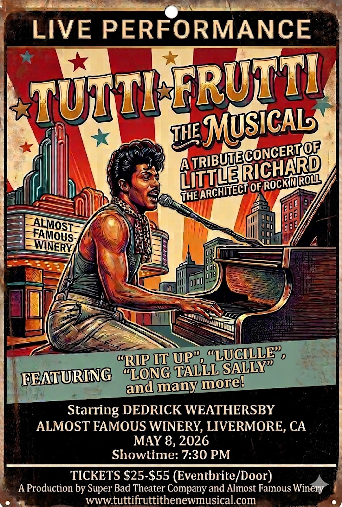 Following its critically acclaimed West Coast Premiere at the Lesher Center for the Arts, this professional production is hitting the stage as a focused, 80-minute concert experience. While the full-length musical dives into the drama of Richard Penniman’s life, this concert version is a pure celebration of the music, recreating the fast-paced, soulful, and wild atmosphere of his most iconic Hollywood performances.