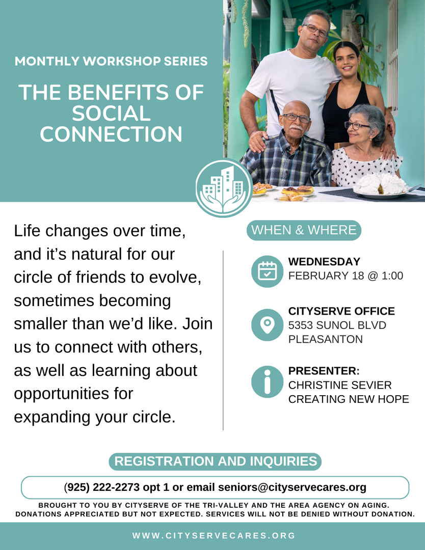 Life changes over time, and it's natural for our circle of friends to evolve, sometimes becoming smaller than we'd like. Join us to connect with others, as well as learning about opportunities for expanding your circle.