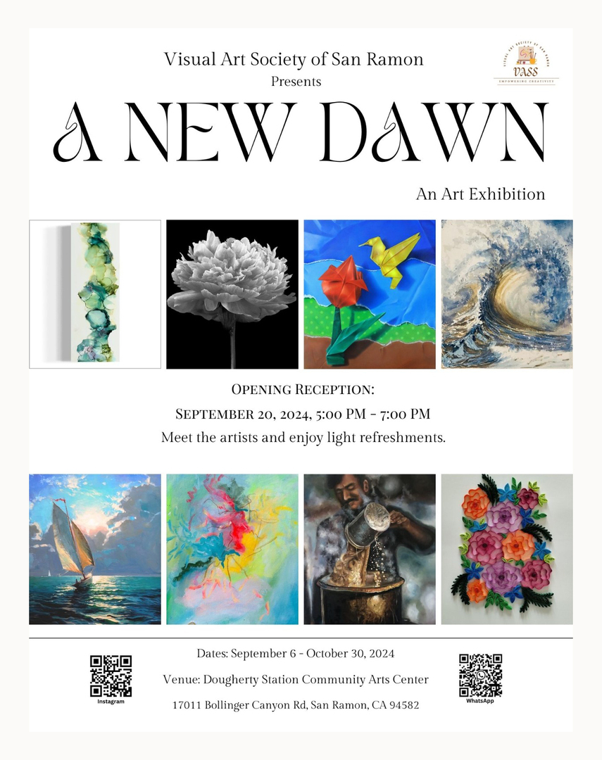 Join the Visual Art Society of San Ramon (VASS) for their inaugural juried art exhibition, "A New Dawn," showcasing a diverse collection of works by invited & juried local artists. The exhibition reflects the vibrant artistic spirit of San Ramon and symbolizes the beginning of VASS’s mission to foster creativity and community engagement.