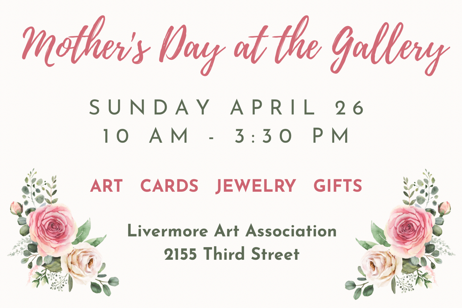 Join the Livermore Art Association Gallery for its annual Mother’s Day event in front of the gallery on 3rd Street on April 26. In addition to unique jewelry, cards, and gifts inside the gallery, guest artists will be outside with beautiful artwork.