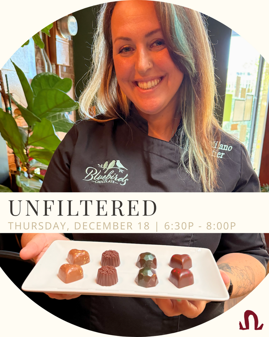 Your ticket purchase includes a complimentary beverage (glass of wine or non-alcoholic) and small bites... PLUS a mini chocolate tasting! Additional glasses/bottles may be purchased at Unfiltered.
